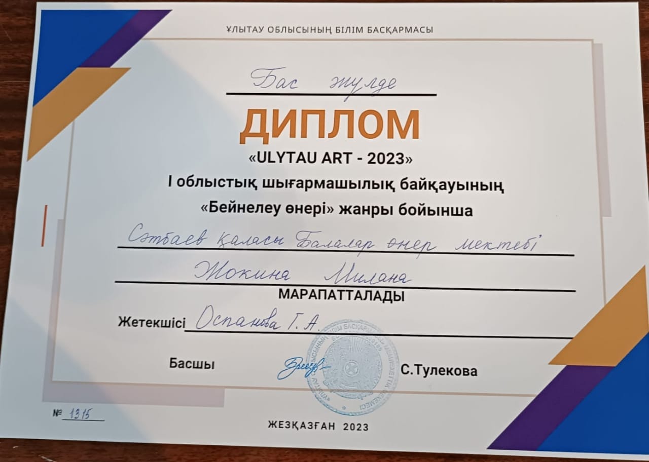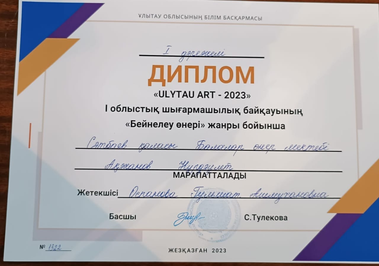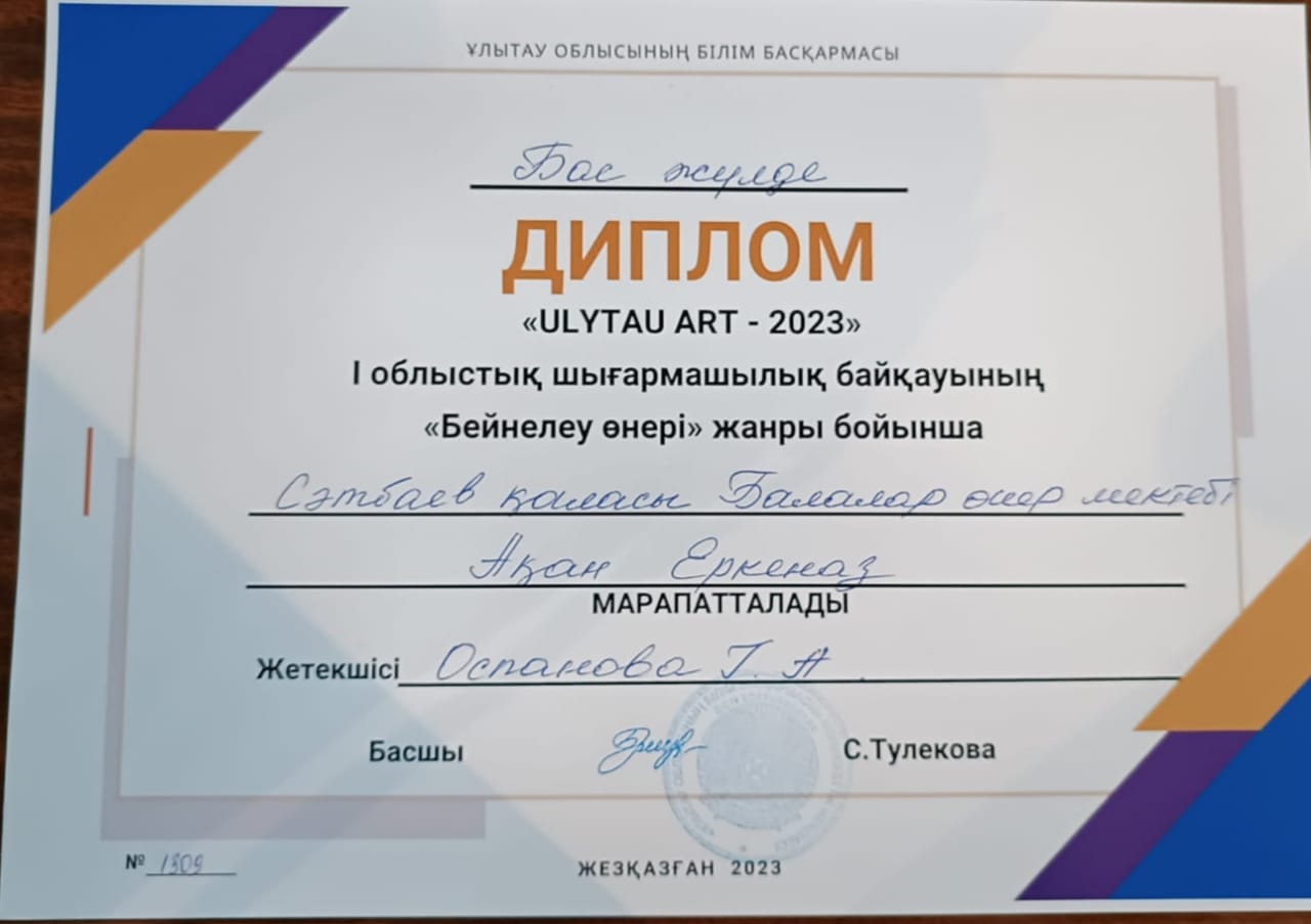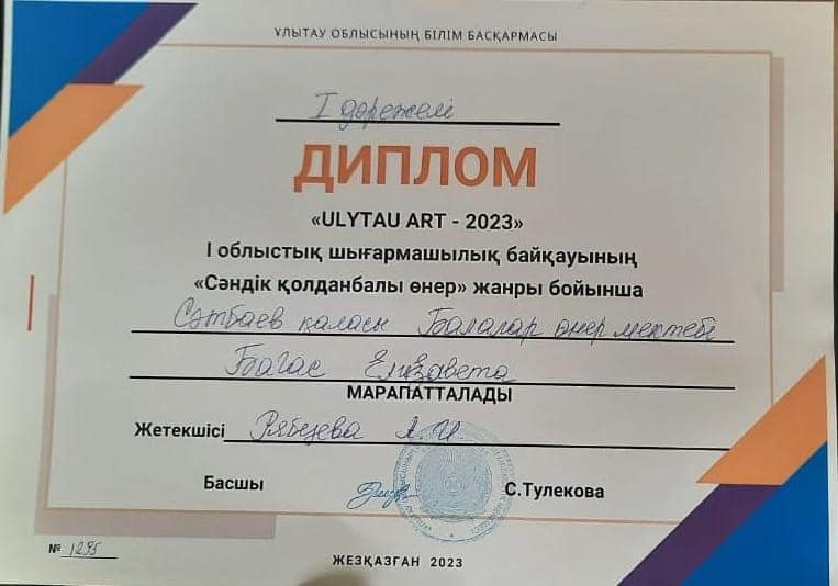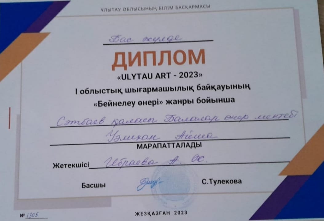 Поздравляем победителей, всех участников и руководителей, готовивших ребят , на I Областной конкурс детского твочества "ULYTAU ART -2023" !!! Желаем дальнейших творческих побед и высоких достижений!