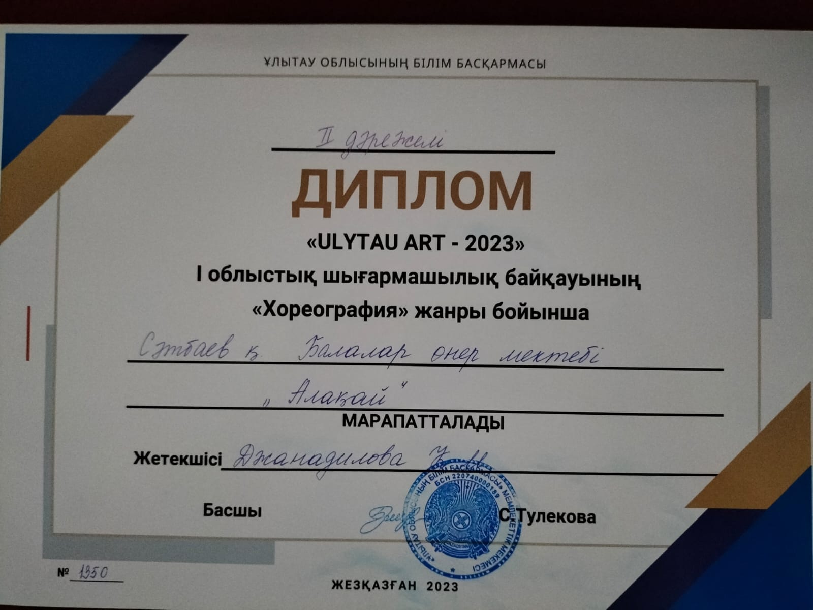 Диплом 2 степени -Образцовый хореографический ансамбль "Алакай" Джанадилова К.М.