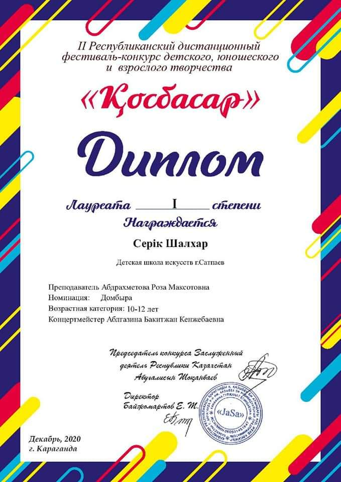 Балалар өнер мектебі "Халық аспаптар бөлiмiнiң оқушылары II Республикалық "Қосбасар" байқауына қатысып жүлделi орындарға ие болды