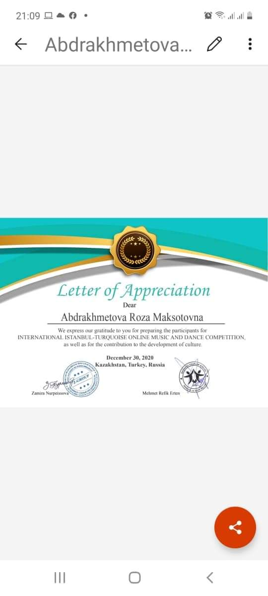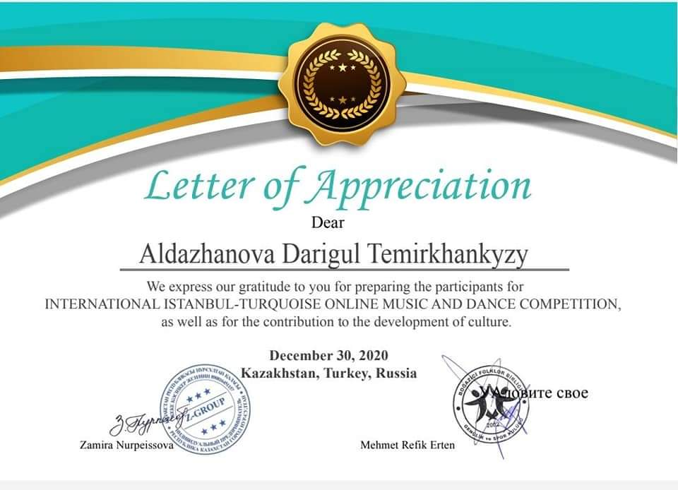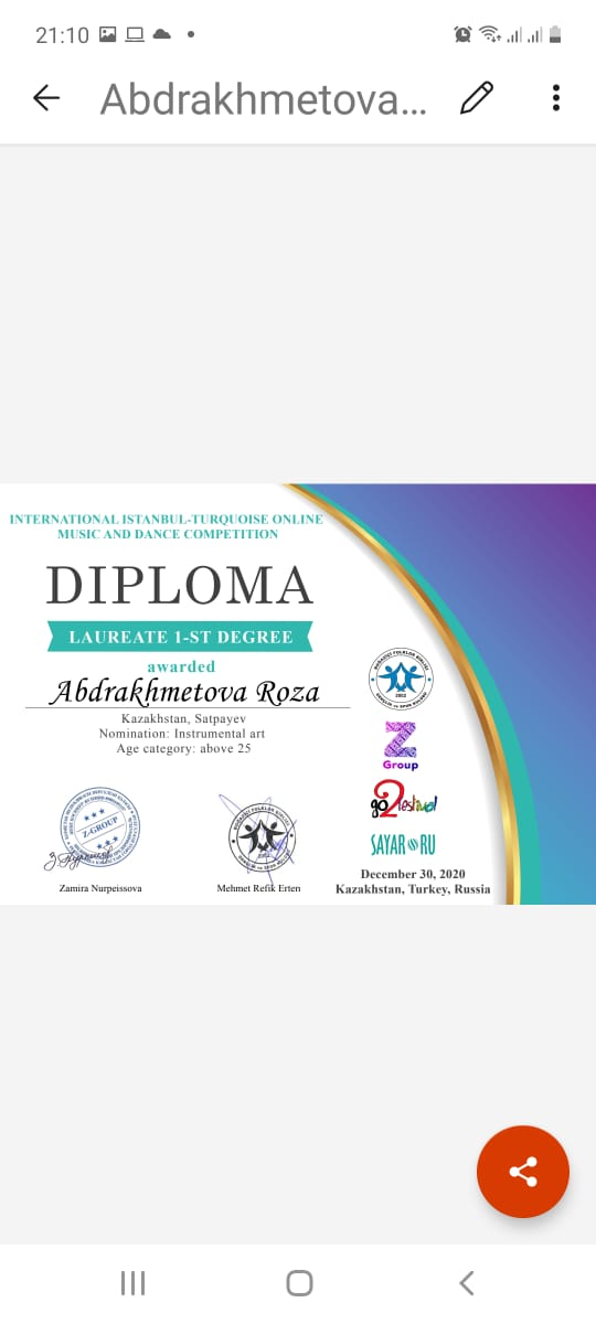 ҚМҚК "Сәтбаев қаласы" Балалар өнер мектебі. Халықаралық қашықтықтан ұйымдастырылған "ISTANBUL-TURQUOISE" байқауы. Халық аспаптар бөлiмiнiң оқушылары Серiк Шалхар, Қалмажит Дильназ дипломдармен марапаттады. Жетекшiлерi Абдрахметова Р. М.