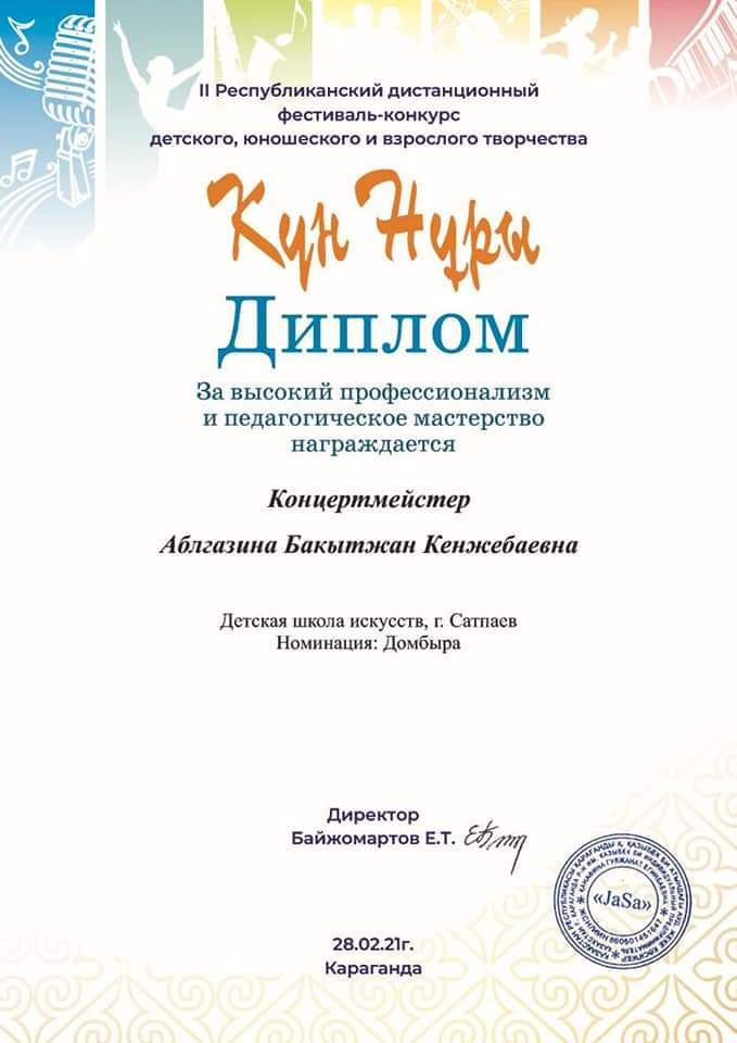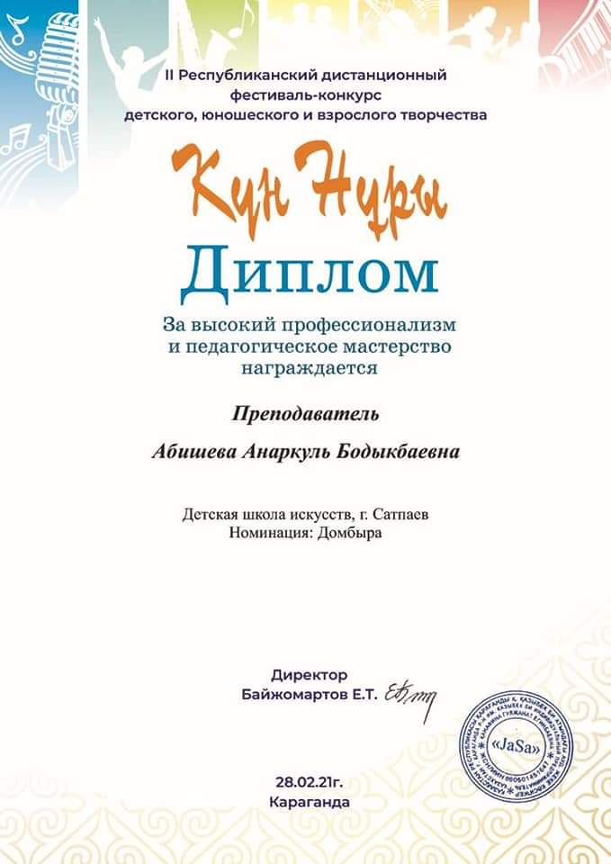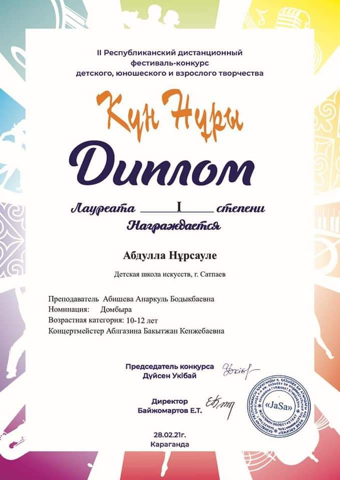 ҚМҚК"Сәтбаев қаласы" Балалар өнер мектебі халық аспаптар бөлiмiнiң оқушылары II Республикалық қашықтықтан ұйымдастырылған "Күннің нұры" байқауы Қарақойшинова Нұрай, Абдулла Нұрсәуле 1-шi дәрежелі дипломдар ға ие болды ұстазы Абишева Анаркуль Бодыкбаевна сүйемелдеушi Аблгазина Бакытжан Кенжебаевна жеңiстерiңiзбен құттықтаймыз.