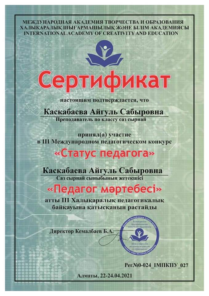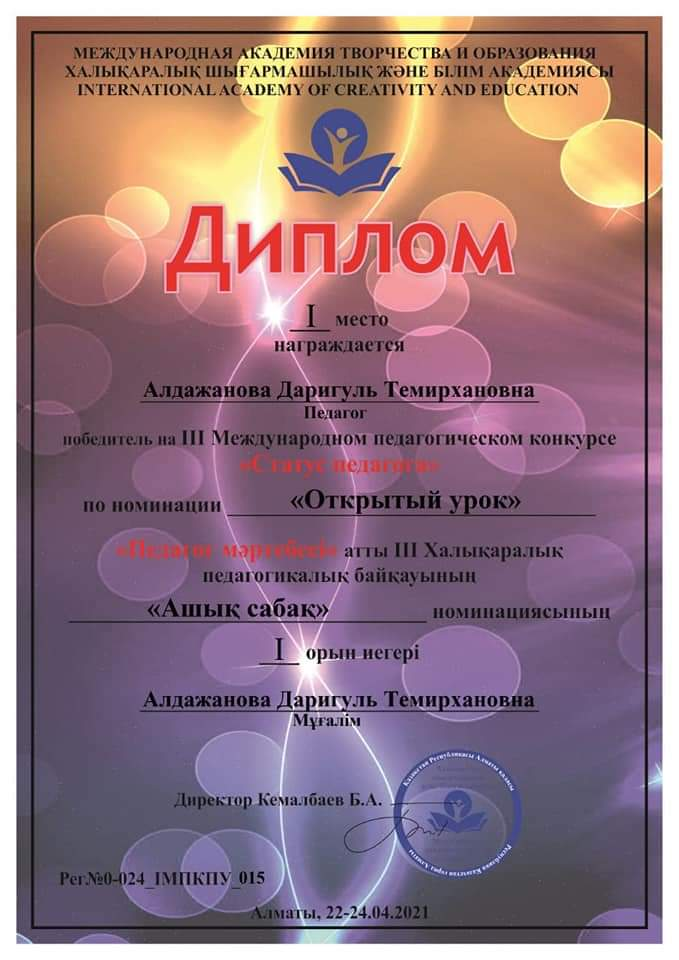 "Педагог мәртебесi" атты III Халықаралық педагогикалық байқауында "Педагог портфолиосы" және "Ашық сабақ" номинациялары бойынша жүлделi