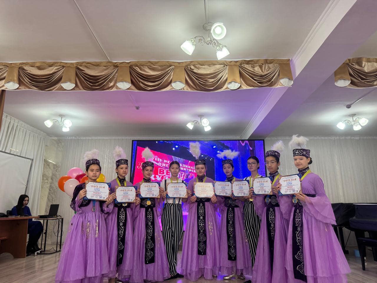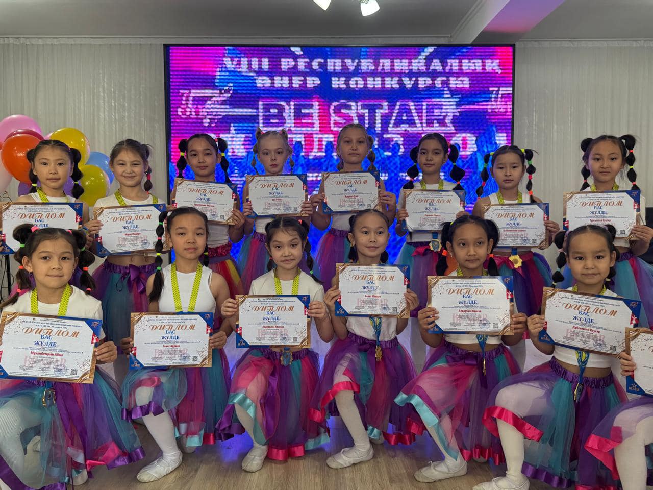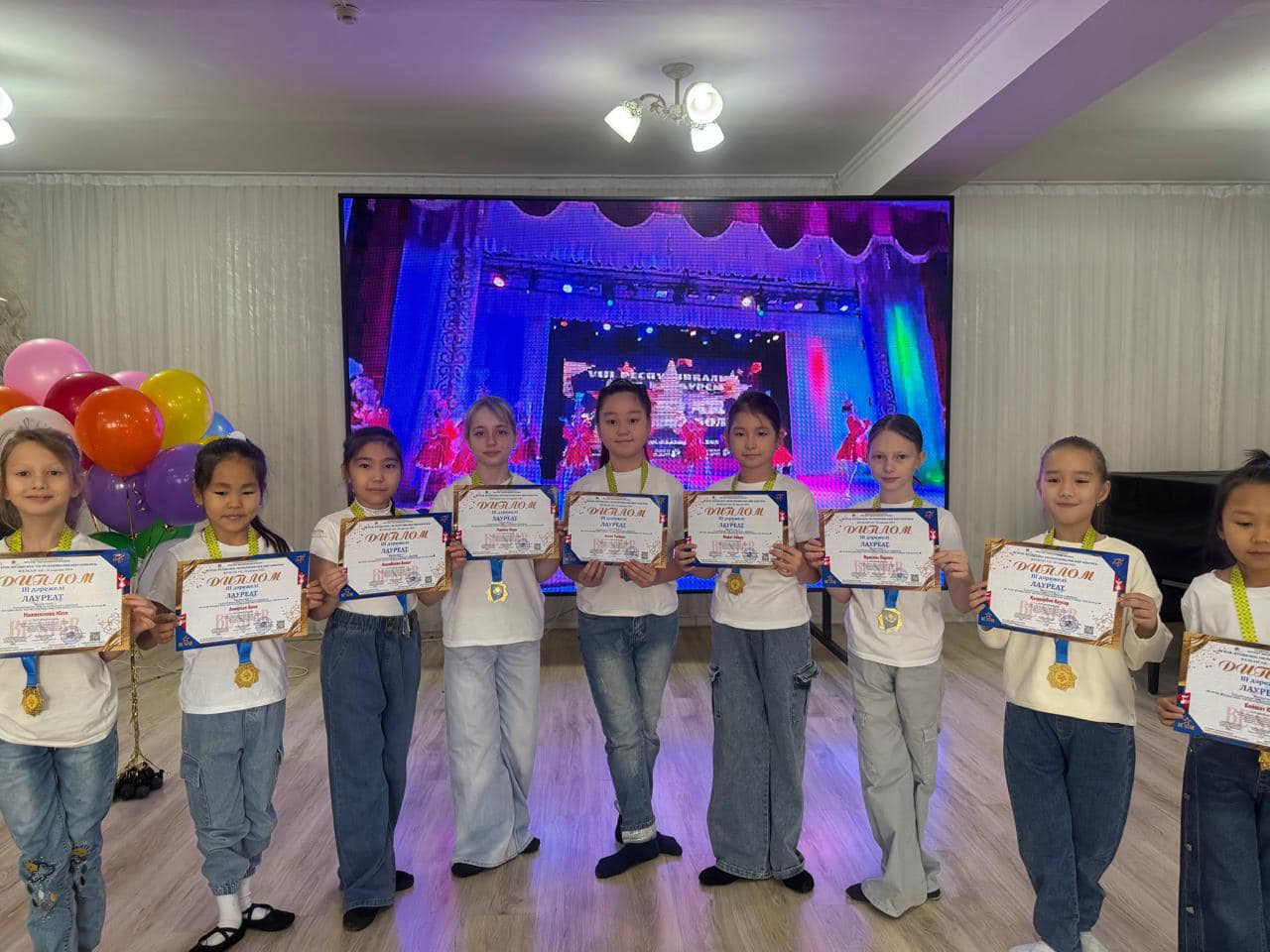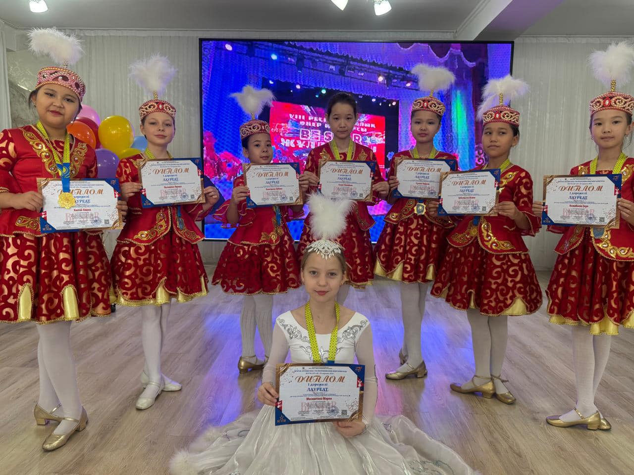 1. “Воздушные шарики” - Алтын Гран-при 2. “Тик-ток” - І орын Жетекшісі: Джанадилова Қ.М 3. My dance” - І орын 4. Қазақ биі “Балдәурен” - І орын Жетекшісі: Русанова А.А 5. “Shine” - III орын Жетекшісі: Шевченко Е.А 6. “Қамажай” - ІІ орын Жетекшісі: Таева Г.Д 7. “Аққу” - Москвитина Мария жеке орындау. Ұжымға “Самая дружная семья” кубогі, әр топ мүшелері диплом мен медальонмен марапатталды. Ұстаздары Русанова А.А., Таева Г.Д., Джанадилова Қ.М., және Шевченко Е.А. “үздік педогог” дипломы, жеке естелік мүсіндер табыс етілді. Оған қоса әр ұстазға 2024-2025 оқу жылында Астана қаласында “BILIM ORKENIETI” ұлттық инновациялық ғылыми-зерттеу орталығының ұйымдастыруымен өтетін педогогтарға арналған форумдарға қатысуға - 15% жеңілдікпен шақыртуға ие болғандығын растайтын Сертификат берілді. “Алақай” үлгілі би ансамблі 2024-2025 жылы “Жеті өнер” шығармашылық орталығының ұйымдастыруымен Түркия, Өзбекстан мемлекеттерінде өтетін халықаралық конкурстарға - 15% жеңілдікпен шақыртуға ие болды. Хореография бөлімінің оқушылары және ұстаздарын марапаттарымен құттықтаймыз.