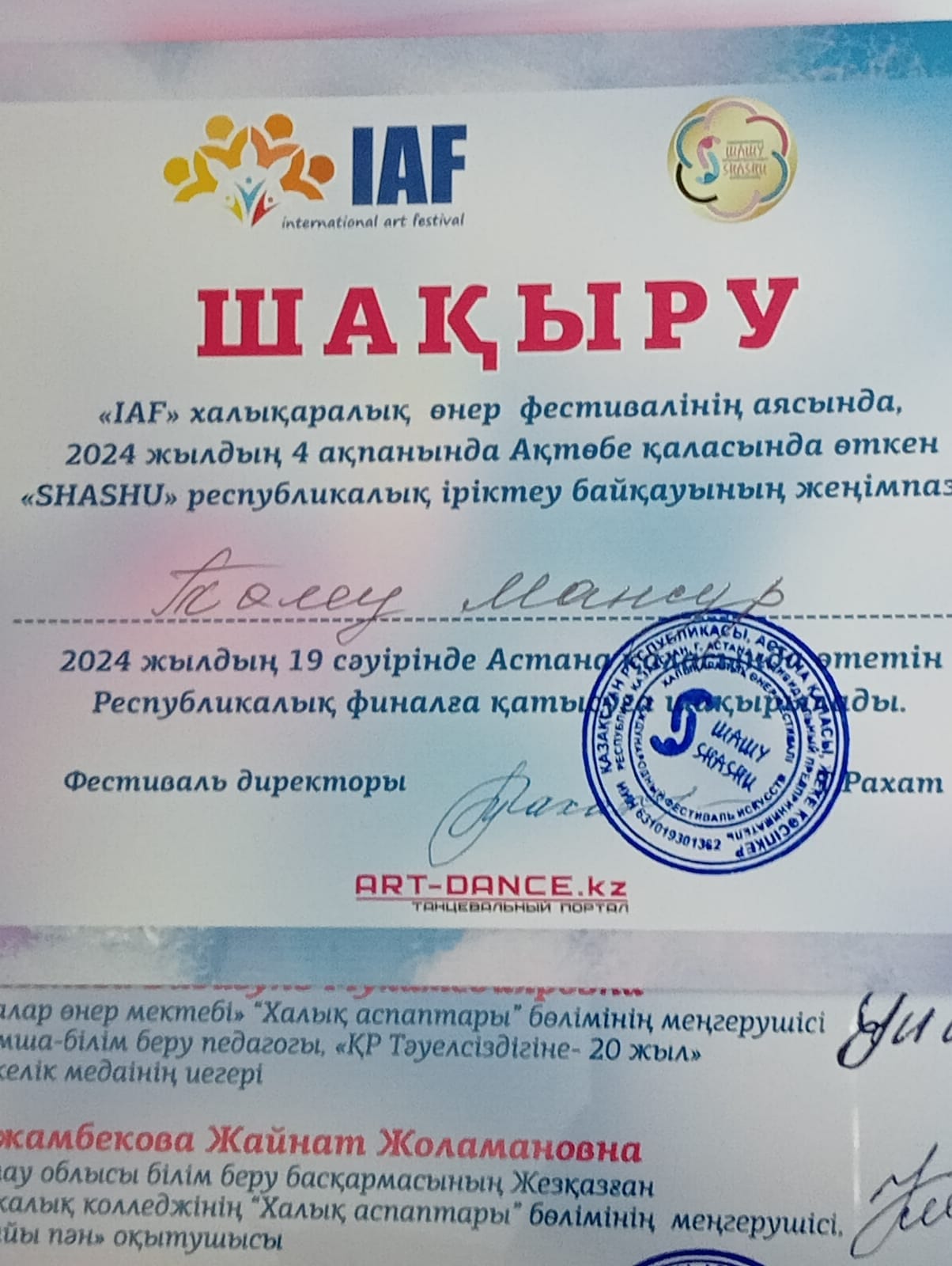 Сүйінші !!! Сәтбаев қаласы "Балалар өнер мектебінің" 4 сынып оқушысы Төлеу Мансұр "lAF" халықаралық өнер фестивалінің аясында 2024 жылдың 4 ақпанда Жезқазған қаласында өткен "SHAHU" республикалық іріктеу байқауында Бас жүлдені иеленді. 19 сәуірде Астана қаласында өтетін Республикалық финалға қатысуға жолдама алды. Ұстазы Оразалин М. Б. Құттықтаймыз!!!
