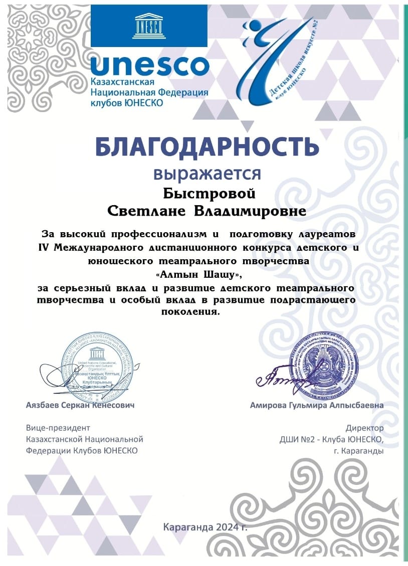 Детский театральный коллектив «Территория Т» принял участие в IV Международном дистанционном конкурсе детского и юношеского театрального творчества «Алтын Шашу», организаторами которого являются КГКП «Детская школа искусств №2 - клуб ЮНЕСКО» г. Караганды при поддержке Республиканского учебно - методического центра дополнительного образования Министерства просвещения Республики Казахстан, Казахстанской Национальной Федерации Клубов ЮНЕСКО. На конкурс было представлено 67 спектаклей разных жанров: драматических, музыкальных, кукольных. В конкурсе приняли участие коллективы из Казахстана, Кыргызстана, России. В жюри конкурса были деятели культуры, театральные педагоги, актеры и режиссёры Казахстана, Кыргызстана и России. Детский театральный коллектив «Территория Т» представил спектакль «Ночь перед Рождеством» и получил почётное III место.