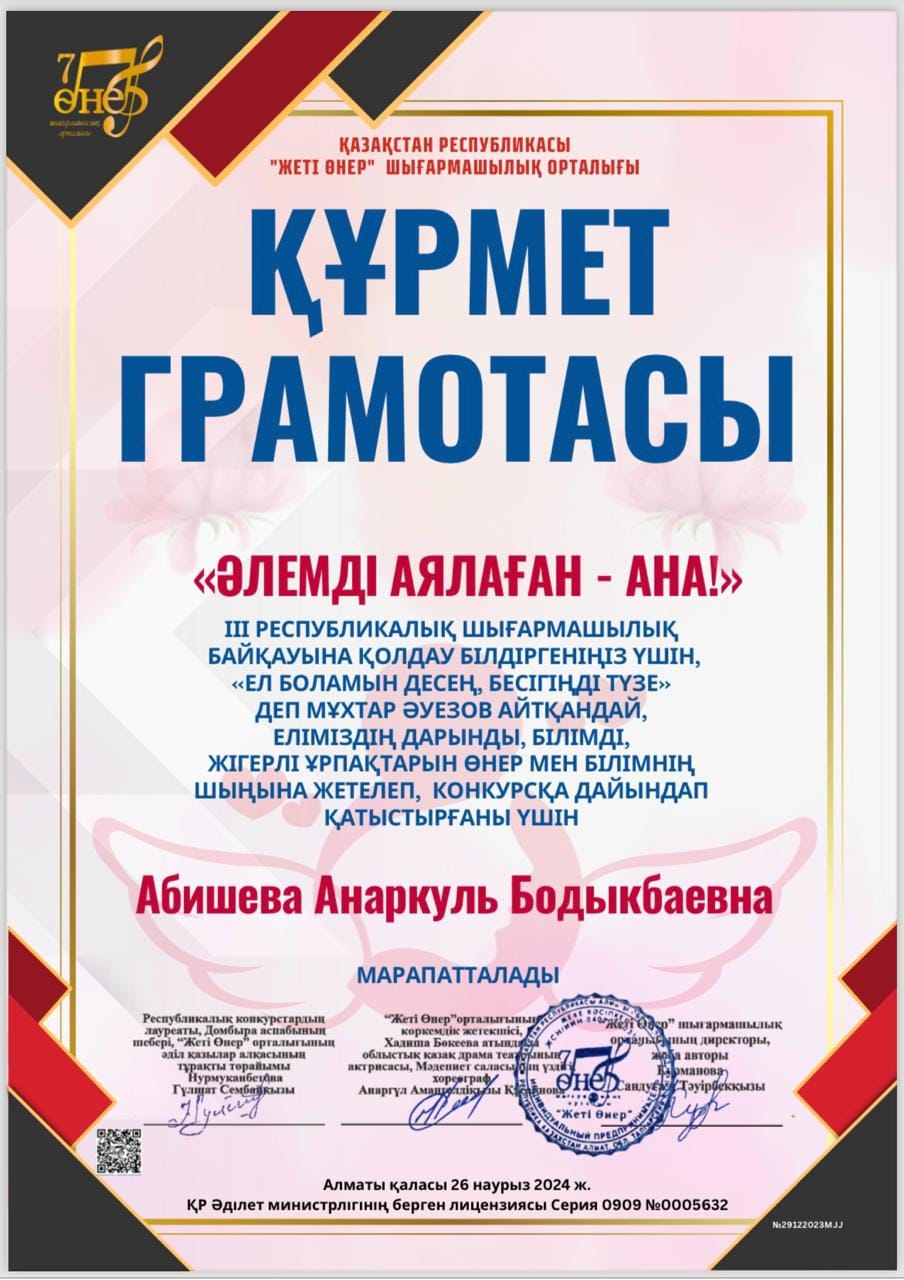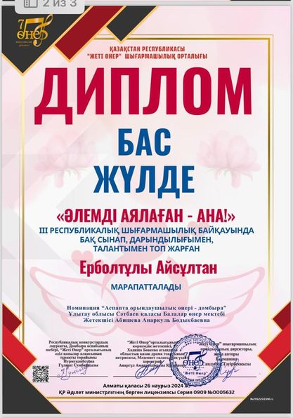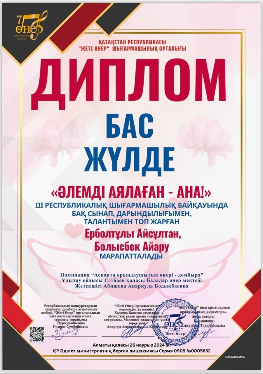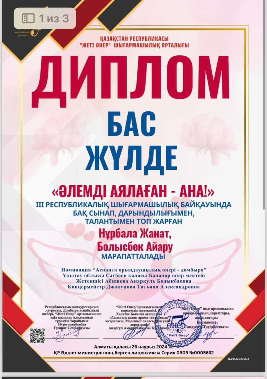 Сәтбаев қаласы “Балалар өнер мектебінің” халық аспаптар бөлімінің оқушылары ( ұстазы Абишева А.Б, концертмейстр Т.А) Алматы қаласында өткен ІІІ Республикалық “Әлемді аялаған-ана” байқауына қатысып, “Аспапта ойнау орындаушылық өнері-домбыра” номинациясы бойынша Болысбек Айару, Нұрбала Жанат, Ерболатұлы Айсұлтан бас жүлдеге ие болды.