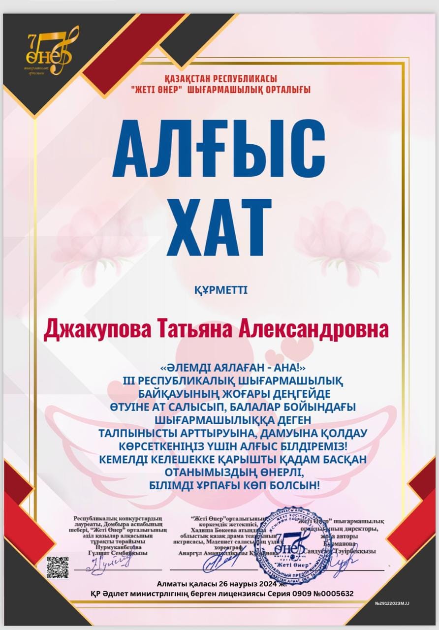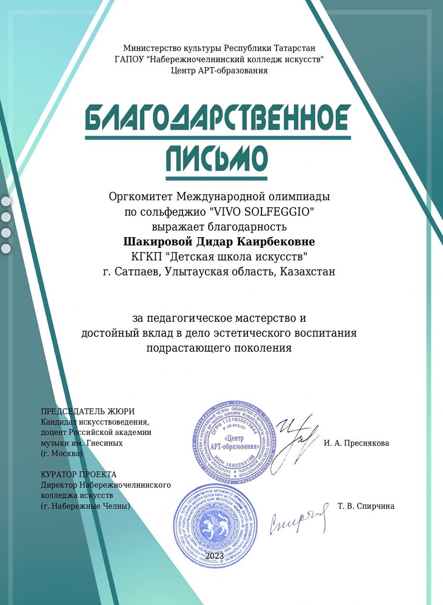От всей души поздравляем ученицу ДШИ Қадырсізқызы Қәусар Лауреата I степени- победителя Международной олимпиады по сольфеджио"VIVO COLFEGGIO" Республики Татарстан г.Набережные челны, а также ее руководителя преподавателя музыкально-теоретических дисциплин Шакирову Дидар Каирбековну!Желаем Вам и в дальнейшем заслуженных наград и высоких достижений!!!