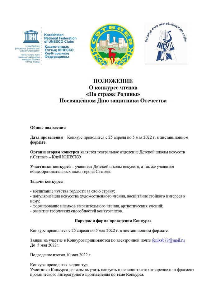 Детская школа искусств г.Сатпаев приглашает учащихся школ принять участие в Городском конкурсе чтецов «На страже Родины»