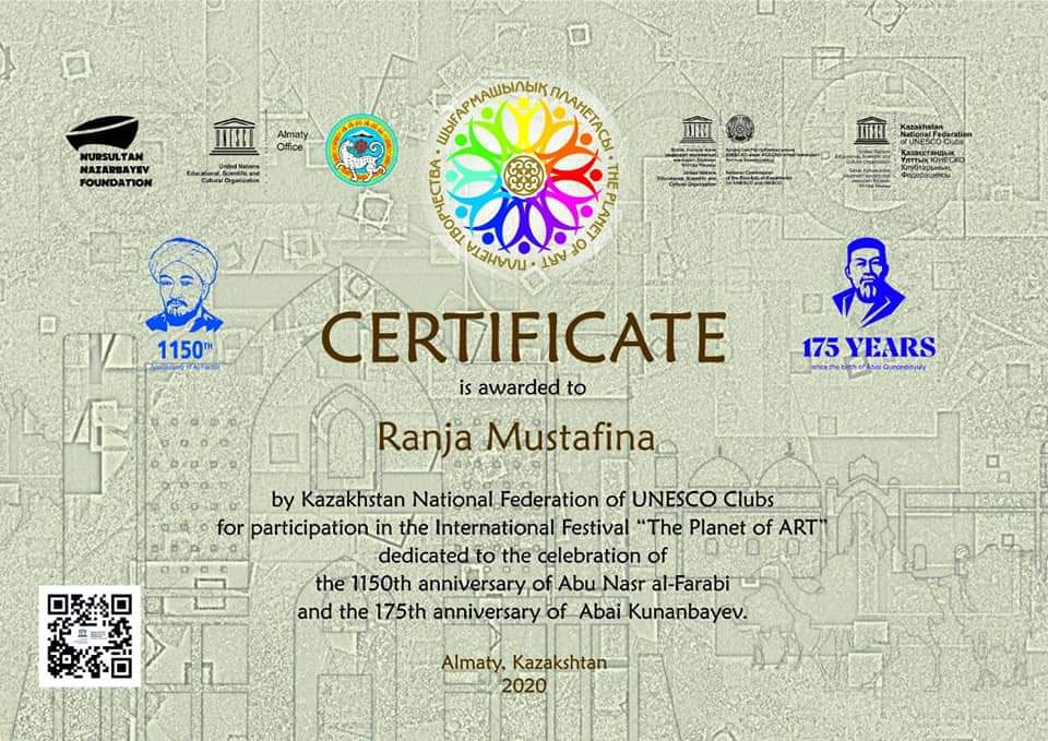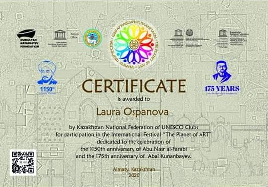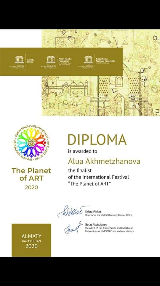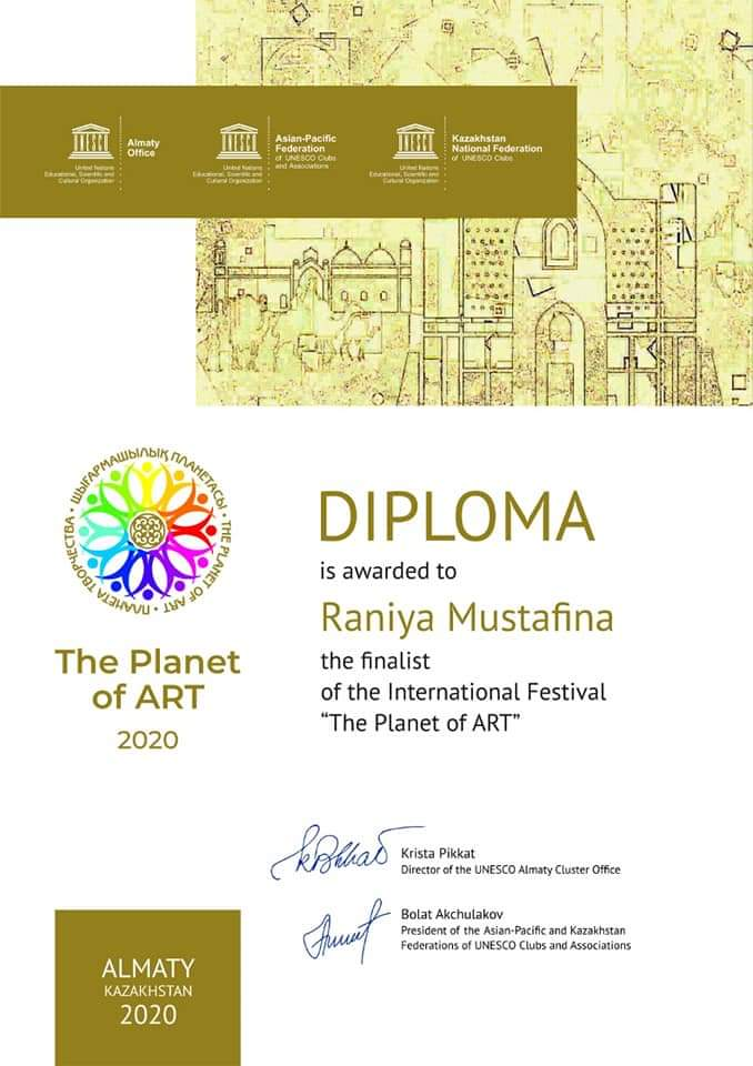 Учащиеся отделения изобразительных искусств приняли участие в Международном ежегодном фестивале "The Planet of ART" - проекте Казахстанской Национальной Федерации Клубов ЮНЕСКО, От всей души поздравляем победителей и их руководителей!!! Вот они наши победители: Алексева Арина (рук. Артес Э. Г.), Мустафина Рания (рук. Ким Э. А.), Ахметжанова Алуа, Мереке Асыл, Абулмажитова Молдир(рук. Оспанова Г.А. ), Ильясова Гульсезим (рук.Адамиянова.С.С. )