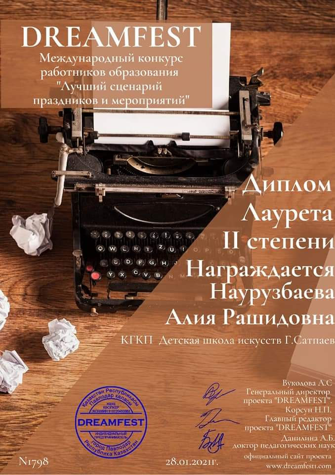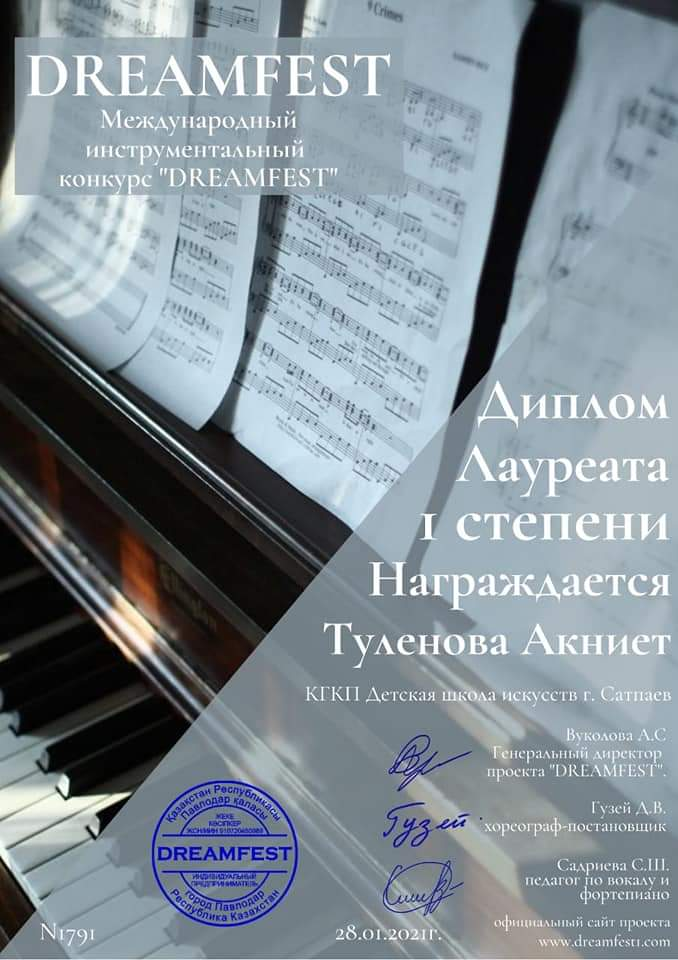 28 января в г.Павлодар проходил Международный дистанционный конкурс"DREAM FEST".Учащиеся фортепианного отделения приняли активное участие и заняли призовые места.Шернияз Нұрасыл-Гран при.Туленова Акниет-1 место.Жумашев Санжар-2 место.педагог Наурузбаева А.Р. а также педагог Наурузбаева А.Р приняла участие в Международном проекте"DREAM FEST"и была награждена дипломом 2 степени.