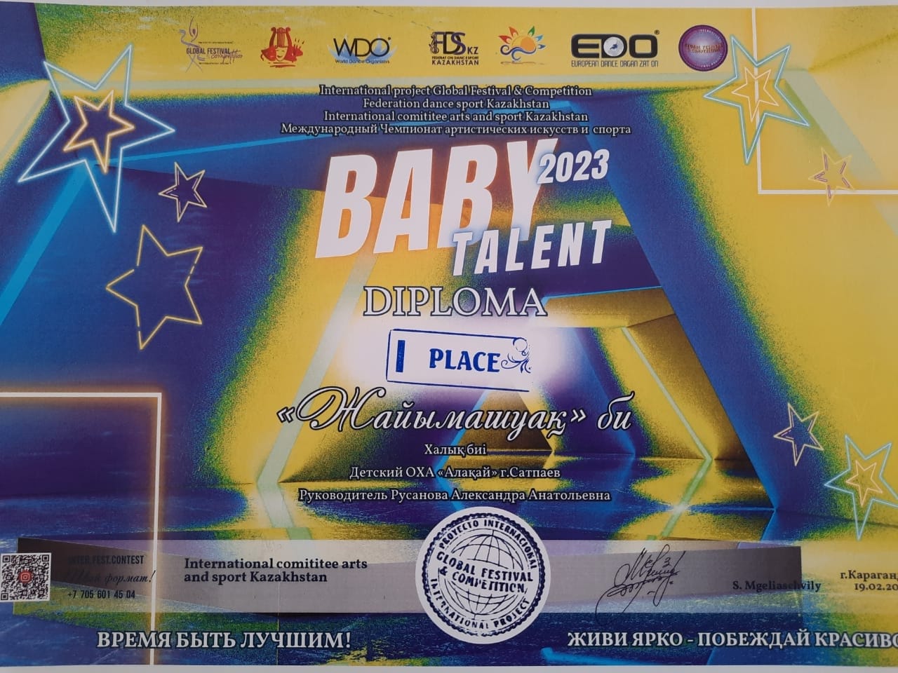 19 февраля 3 группы образцового хореографического ансамбля "Алакай" приняли участие в Международном Чемпионате артистических искусств и спорта " BABY TALENT 2023", который проходил в г. Караганда. Наши дети выступили отлично и были удостоены высоких наград: В номинации Халық биі выступила средняя группа с казахским танцем "Жайымашуақ", заняли 1место, руководитель Русанова Александра Анатольевна. В номинации Эстрадный танец выступила младшая группа с танцем "Шкатулка " - GRAND PRIX, руководитель Русанова Александра Анатольевна. Ещё одна младшая группа выступила в номинации Народный танец с индийским танцем "Nagada Sang" тоже заняли высокое призовое место "GRAND PRIX", руководитель Джанадилова Карлыгаш Маратовна. Мы гордимся своими педагогами и учащимися !